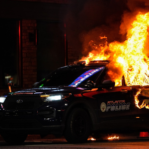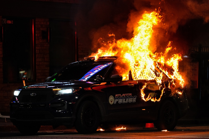 当地时间2023年1月21日,美国佐治亚州亚特兰大,“Stop cop city”抗议活动中,一辆亚特兰大警车被点燃。多栋建筑遭到破坏,一辆亚特兰大警车被点燃,多人被捕。图片来源:视觉中国