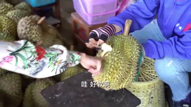 总台记者 杨探骊:在泰国买榴莲有一个规矩,当场切开,大家可以摸一摸。如果里面的肉是软软的就是好榴莲,如果是硬的,商家就给你再换一个。我今天买的这个榴莲,批发价格是150泰铢一公斤,大概就是30块钱人民币一公斤,那其实这个价格涨了不少。泰国榴莲的市场价格和中国市场的需求是密切相关,在疫情期间就跌到了100泰铢,也就是20块钱一公斤。现在你看,春节的需求上来了,泰国的榴莲价格又涨回来了。