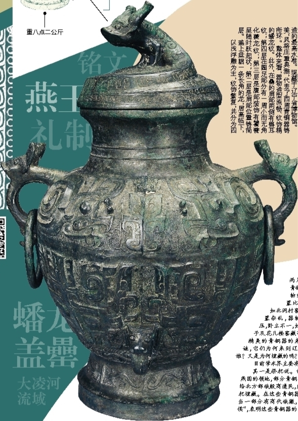 出土于朝阳市喀喇沁左翼蒙古族自治县北洞村窖藏坑的“卷体夔纹蟠龙盖罍”, 为西周早期大型盛酒器,造型华丽精美、庄重典雅,从其纹饰风格和铸造技术来看,应是当时中原文化的产物,代表了西周造型艺术的极高水准。目前,国内已先后发现4件同样造型的蟠龙盖罍。南北蟠龙盖罍“四兄弟”遥相呼应,印证着商周时期青铜文化已经覆盖中华大地,南北文化交流已经相当频繁。