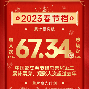 2023年中国电影市场春节档正式收官,据灯塔专业版数据,总票房达到67.34亿元,位列中国影史春节档总票房第二,超2022年春节档总票房60.39亿元。