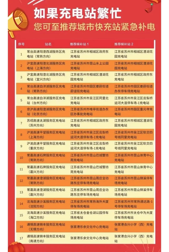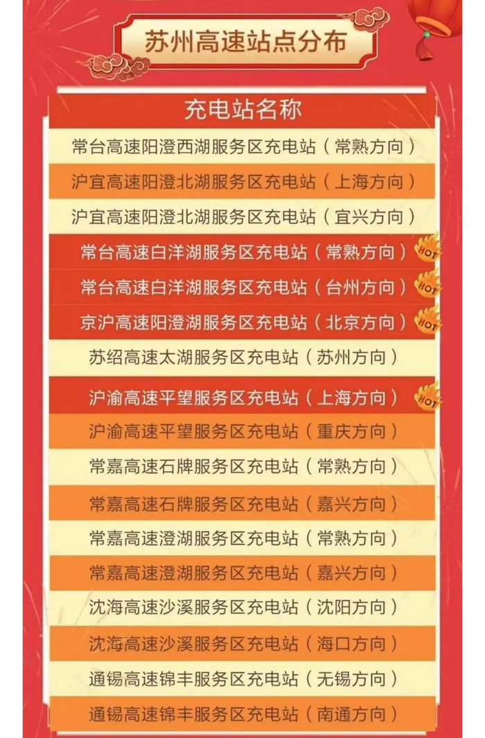 目前,苏州境内充电站有17座,其中常台高速白洋湖服务区充电站(常熟方向)、常台高速白洋湖服务区充电站(台州方向)、京沪高速阳澄湖服务区充电站(北京方向)、沪渝高速平望服务区充电站(上海方向)4座充电站为热门站点。