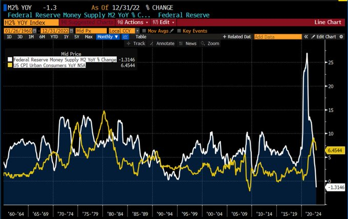2023年才刚刚过去了不到一个月,不过在美国诸多的经济指标中,有两个“负增长”无疑已极为令人印象深刻:其一是本月早些时候美国劳工统计局公布的12月CPI录得环比负增长,为疫情初期以来首次;而第二个“负增长”则出现在本周:美国12月M2货币供应量增速同比录得负值!