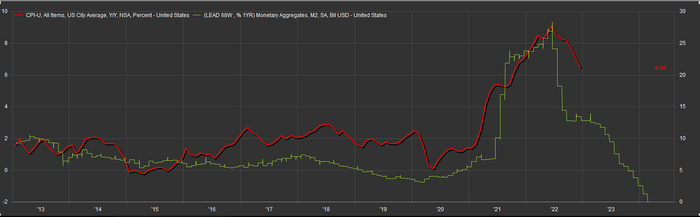 根据经济学家弗里德曼的观点,无论何时何地通胀都是一种货币现象。根据他进一步的研究,广义货币发行量的增长率,大约领先于通胀率12-24个月。