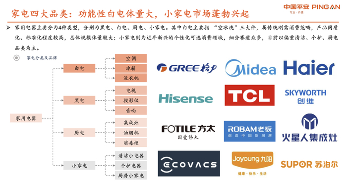 随着保交楼、需求端等地产政策加大发力,防疫政策转段优化、家电补贴持续推进促进线下渠道及居民购买力恢复,家电作为兼具消费属性的地产后周期行业或将迎来困境反转,竣工链的白电&厨电需求有望边际改善;同时小家电等新兴赛道仍处于渗透率快速提升阶段,预计细分赛道仍将维持高速增长