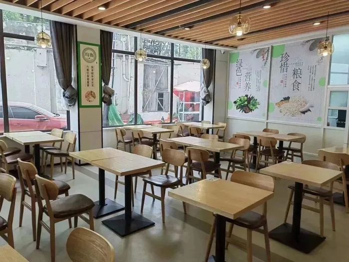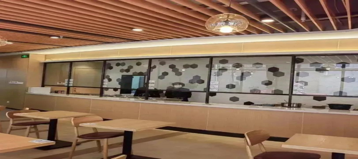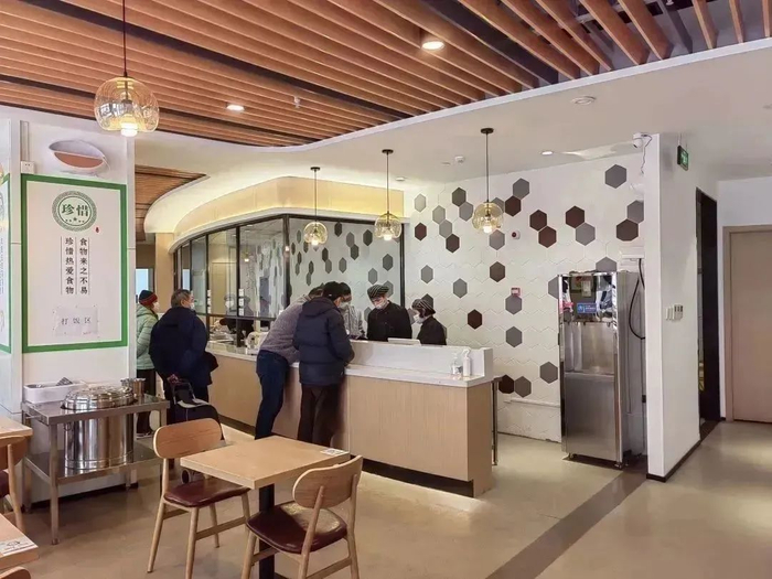 推门而入,是日光透过玻璃照得明亮的大堂、是暖黄灯光与木制桌椅交映出的温馨,分化有序的打菜窗口、收银台、用餐区、打包区将食堂空间充分利用起来。