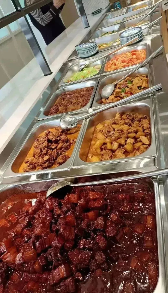 有红烧肉、糖醋小排、红烧鲈鱼等能大快朵颐的肉食,还有五香素鸡、清炒绿豆芽、小炒包菜等清淡菜品,汤品每天会准备不同的两样,并免费供居民食用,荤素搭配均衡,且饭菜的整体调味不重,也不油腻,都是接地气的家常好味道,其中,招牌菜红烧肉最受居民们的欢迎。