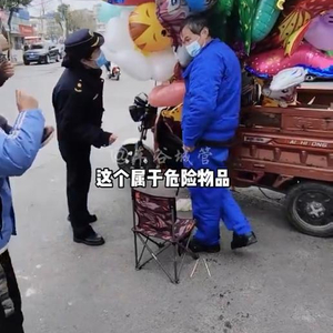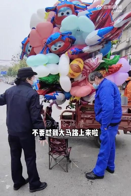 1月24日,湖北武汉。武汉一名网友上传了一段城管劝离摊贩的视频,引来众多网友围观。视频中,一位大叔骑着一辆三轮车,车上绑满了气球,还放了许多小吃和纸钱香烛拿到街上卖。