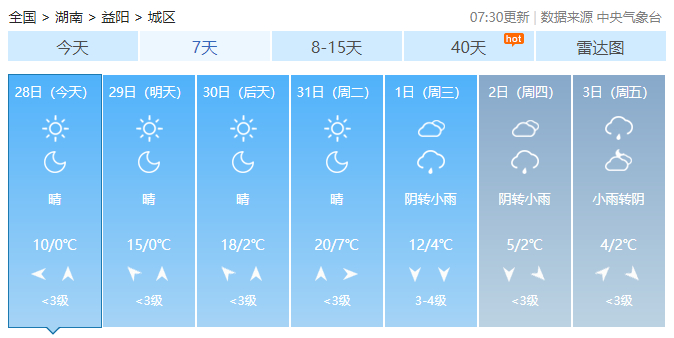 后天08时至31日08时,晴天间多云;南风2~3级;最高气温湘南16~18℃,其他地区19~21℃;最低气温湘南5~7℃,其他地区3~5℃。