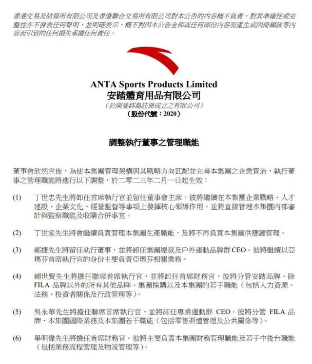 这意味着,安踏在公司治理上形成了“双CEO”格局。这也是安踏体育上市16年以来最大规模的人事调整,将于2023年2月1日起生效。