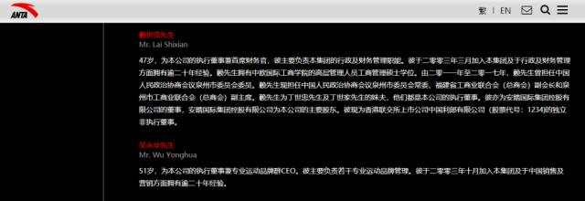 值得一提的是,本次被选作公司一把手的赖世贤和吴永华,在安踏工作时间均有约20年之久。过去,两位元老级成员分别主导公司的行政运营和营销板块,这些优势在其调整后的集团职能上仍有体现。