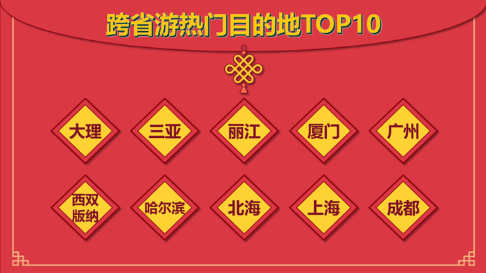 途牛旅游网统计,在目的地选择上,华南、西南以及东北方向受到更多用户的青睐,其中,大理、三亚、丽江、厦门、广州、西双版纳、哈尔滨、北海、上海、成都是更为热门的跨省游目的地。其中,三亚一直保持着较高的吸引力。