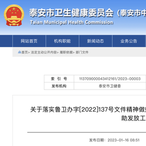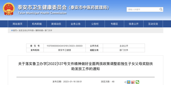 近日,泰安市卫生健康委员会网站发布关于落实鲁卫办字[2022]137号文件精神做好全面两孩政策调整前独生子女父母奖励扶助发放工作的通知。