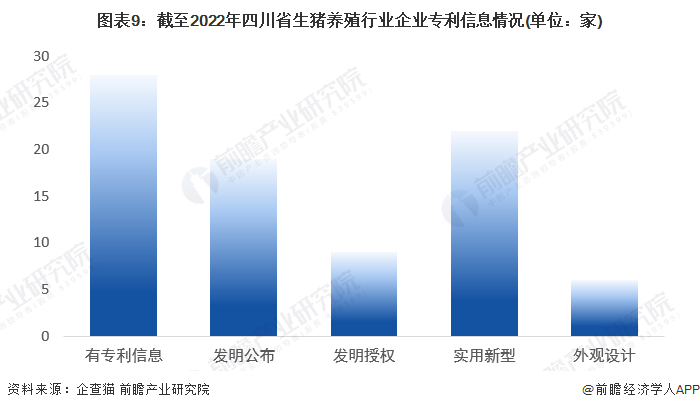 从专利方面来看,目前四川省生猪养殖行业存续和在业的企业共2264家,其中28家企业有专利信息,在专利信息中,生猪养殖行业企业以实用新型专利为主,拥有实用新型专利的企业有22家,申请发明公布的企业有19家。
