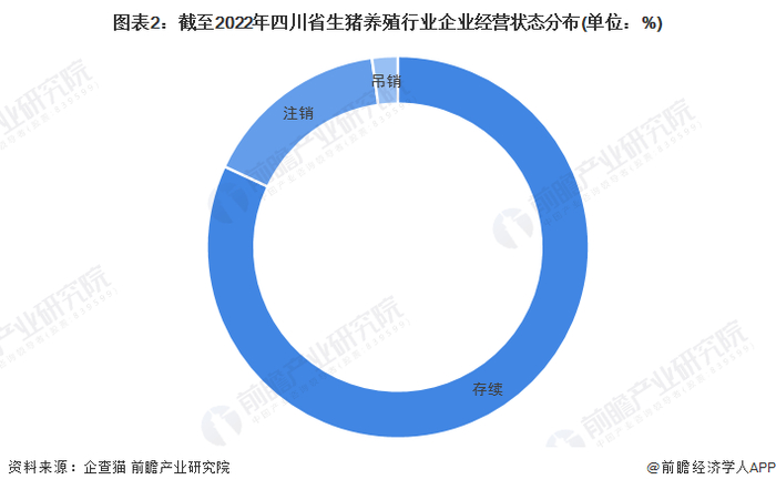根据中国企业数据库企查猫,目前四川省生猪养殖行业的存续企业2264家,占总企业数的82%;注销企业439家,占比为16%,吊销企业数量占总企业数量的2%。整体来看,四川省生猪养殖行业存续企业数量占比超80%,行业发展较为健康。