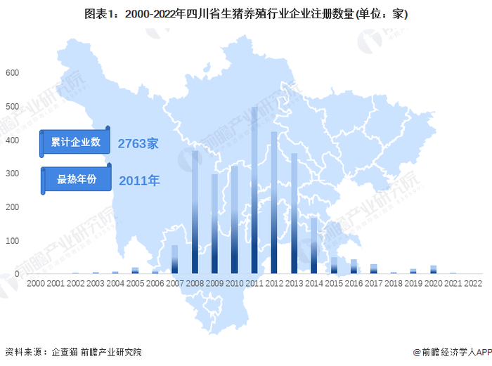 根据中国企业数据库企查猫,目前四川省生猪养殖行业的主要企业共有2763家,其中以2011年为主要注册热潮,2011年四川省生猪养殖注册企业数量达500家;2021年四川省生猪养殖行业新增注册企业数量共有5家,同比减少21家。