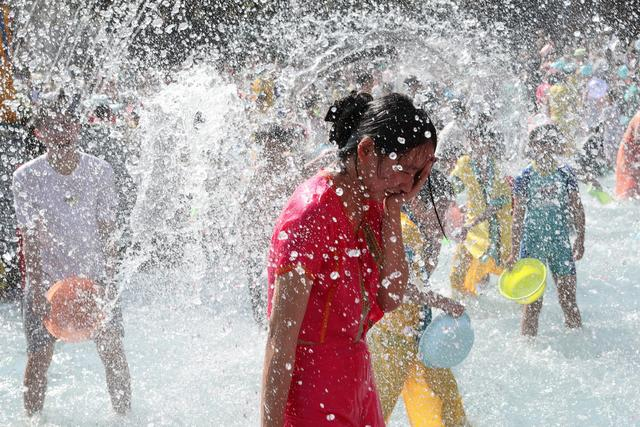 2023年1月25日,游客在西双版纳傣族园景区参加“天天泼水节”活动。