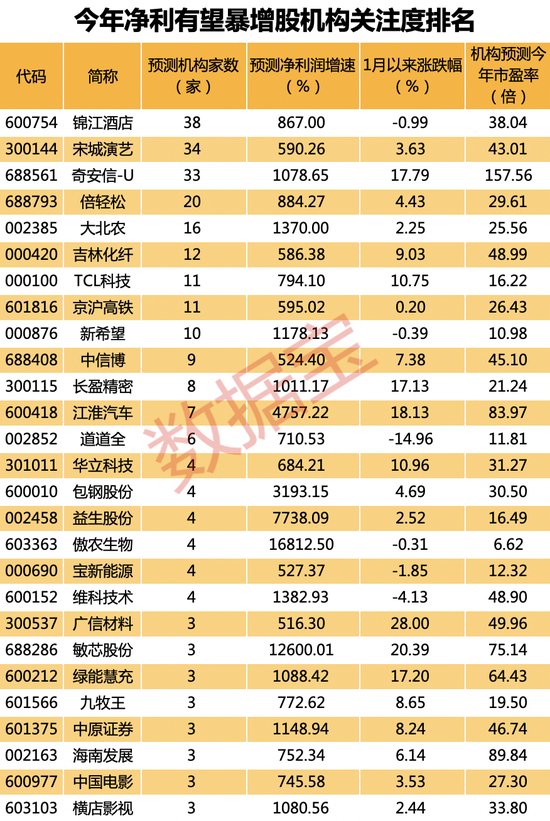 统计显示,有3家以上机构预测今年业绩且机构一致预测去年净利润为正的个股中,有13股今年净利润同比增长有望超过10倍。