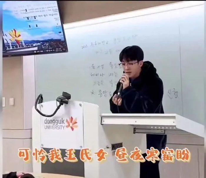 中国留学生在韩国课堂上唱京剧《红鬃烈马》中的一折《武家坡》。/@芒果酱吖吖吖