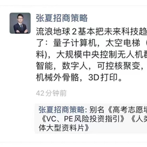 1月27日,招商证券策略首席分析师张夏在朋友圈发表了一则《流浪地球2》观后感,从卖方研究视角剖析这部科幻片中潜在的投资机会。张夏认为,《流浪地球2》基本把未来科技趋势说清楚了,包括量子计算机、太空电梯(超强度材料)、大规模中央控制无人机群、人工智能、数字人、可控核聚变、机器人、机械外骨骼、3D打印等等。