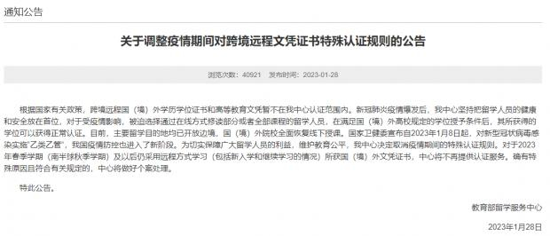 新冠肺炎疫情爆发后,教育部留学服务中心对于受疫情影响,被迫选择通过在线方式修读部分或者全部课程的留学人员,在满足国(境)外高校规定的学位授予条件后,其所获得的学位可以获得正常认证。目前,主要留学目的地均已开放边境,国(境)外院校全面恢复线下授课。为切实保障广大留学人员的利益,维护教育公平,教育部留学服务中心决定取消疫情期间的特殊认证规则。对于2023年春季学期(南半球秋季学期)及以后仍采用远程方式学习(包括新入学和继续学习的情况)所获国(境)外文凭证书,中心将不再提供认证服务。确有特殊原因且符合有关规定的,中心将做好个案处理。