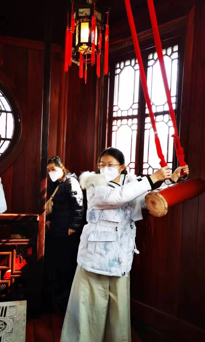 “在寒山寺钟楼里敲钟,聆听悠扬的钟声,我们一起为新的一年祈福,祝福家人身体健康,也祝福我学业有所进步。站在江边,‘枫桥夜泊’的诗境实景再现,更让人陶醉其间。”刘怡说。
