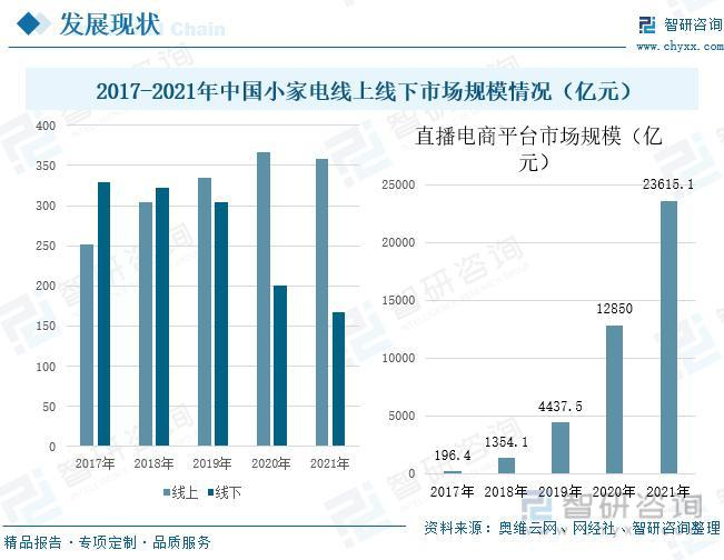随着互联网的发展,消费者网购习惯的养成,在互联网上购买小家电产品已经成为习惯,同时直播电商的发展促使小家电市场潜力不断被挖掘在。据统计,在2017-2018年间,小家电的市场规模以线下为主,但是在2019-2021年间,中国小家电线上市场规模超过线下,其中,2020年新冠疫情使小家电销售渠道进一步向线上转移,社交电商、直播等线上新营销模式发展迅速,将助推线上渠道销售额占比进一步提升。在2021年中国直播电商平台市场规模已经达到了23615.1亿元。