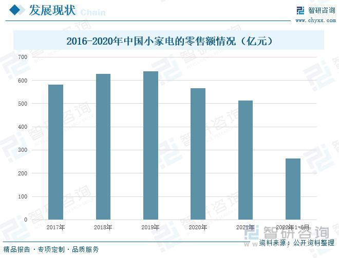 小家电作为一种帮助消费提升生活品质,让生活更加便利的家用电器,适用多种生活场景,满足人们一定的功能诉求,品类繁多。目前,随着人们收入水平的提高以及懒人经济的发展,小家电因其轻便、简单而受到人们的欢迎,据统计,在2017-2019年间,小家电行业的零售额整体呈现上升趋势,2020年遭受疫情冲击,线下门店经营惨淡,整个行业市场零售额处于下降状态,2021年由于厨房小家电多数品类进入饱和期,需求疲软,从而导致品牌的流失,以及叠加疫情影响原材料的涨价,使得我国小家电行业的持续低迷,2022年上半年中国小家电零售额为264亿元,同比下降了4.9%。由于人们的消费需求存在多样化的转变,因此,小家电行业需要不断地改造升级以适应消费者的需求变化,在自动化、便捷化的基础上朝着多功能化、高颜值化、智能化、健康化等方向持续扩张,使得小家电市场规模不断扩大。