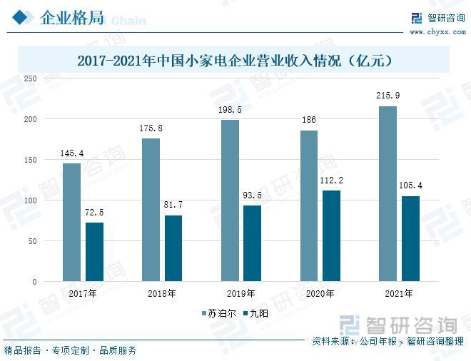苏泊尔是国内著名的炊具研发制造商,中国厨房小家电的领先品牌,是中国炊具行业首家上市公司,主营业务包括明火炊具、厨房小家电、厨卫电器、生活家居电器四大领域,而九阳股份主要从事小家电系列产品的研发、生产和销售。其中苏泊尔的营业收入在2017-2021年间整体上处于上升状态,但在2020年受新冠肺炎的影响,营业收入同比下降,2021年小家电的营业收入增加到215.9亿元。九阳股份从营业收入来看,在2017-2020年间中国小家电营业收入逐步增加,2021年降至105.4亿元。