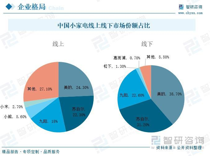 近年来,小家电头部品牌集中发力线上市场,集中度有所提升,尾部品牌受到多方承压。据统计,线上渠道排名前五的企业分别为美的,苏泊尔、九阳、小熊、小米,占比分别为24.30%、22.30%、18%、5.6%、2.7%。线下渠道排名前五的分别为美的、苏泊尔、九阳、松下、惠而浦,占比分别为38.7%、31.2%、22.6%、1.3%及0.7%。不论是线上渠道还是线下渠道,市场都以美的、苏泊尔和九阳为主。