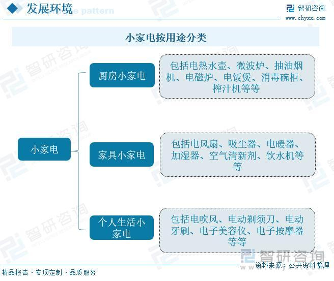 小家电一般是指除了大功率输出的电器以外的家电,一般这些小家电都占用比较小的电力资源,或者机身体积也比较小,所以称为小家电。目前,小家电按用途可以分成三大类,分别是厨房小家电、家具小家电、个人生活小家电。如今小家电已经融入了大多市民的家庭当中,随着消费升级步伐不断加快以及互联网电子商务平台的蓬勃发展,小家电市场体量不断扩张。