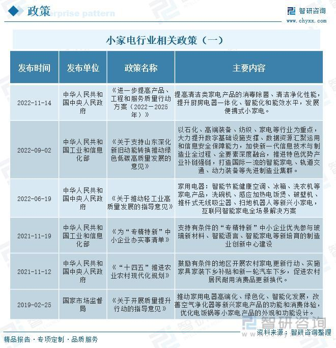 在国家节能、环保政策的助推下,健康、节能的家用电器日渐受到消费者们的青睐,小家电作为我国家电行业的重要分支,其发展也将朝着多功能化、高颜值化、智能化、健康化等方向持续扩张。近年来,国家陆续出台多项政策来支持鼓励小家电行业的发展。在2022年发布的《进一步提高产品、工程和服务质量行动方案(2022—2025年)》中,就提出要提高清洁类家电产品的消毒除菌、清洁净化性能,提升厨房电器一体化、智能化和能效水平,发展便携式小家电。在2019年发布的《关于开展质量提升行动的指导意见》中,提出要推动家用电器高端化、绿色化、智能化发展,改善空气净化器等新兴家电产品的功能和消费体验,优化电饭锅等小家电产品的外观和功能设计。这一系列政策的发布,将给小家电行业的发展提供了明确、广阔的市场前景,为企业提供了良好的生产经营环境。