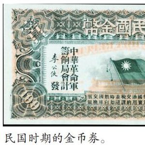 中华民国金币,即中华民国金币券,是孙中山1911年5月在美国旧金山成立“中华革命军筹饷局”,并印刷一组名为“中华民国金币”的革命军筹饷券。孙中山亲自参与设计,由李公侠负责印刷。“中华民国金币”是孙中山海外筹集起义经费时发放的筹款凭证,也是众多海外华侨支持辛亥革命的实物史料。