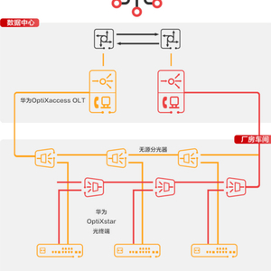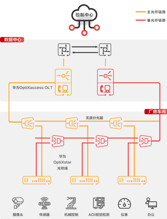 具体来看,该架构首先从工厂的数据中心建设主光纤链路和备份光纤链路到厂房车间。在厂房车间,通过无源分光器将光纤连接到华为OptiXstarT823E系列光终端中。再由华为OptiXstarT823E系列光终端将光信号转换为电信号,为厂房车间的摄像头、传感器、制造机器人、AOI视觉检测、仪表、办公等提供网络接入。