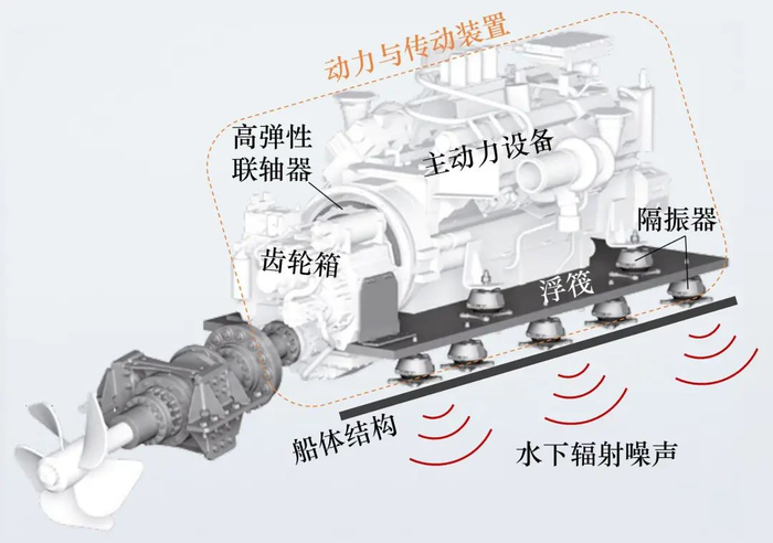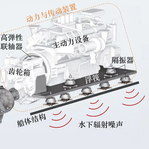 船舶推进系统在运转过程中不可避免地产生振动,如船舶主机运转产生的激励力、螺旋桨在艉部伴流场中运转产生的脉动力等。这些激励通过安装基座、轴承及其支承等传递至船体结构,进而诱发船体结构振动,引起水下低频辐射噪声。例如,在振动声辐射方面,船舶动力与传动装置是直接驱动主轴和螺旋桨的动力来源,运转过程中产生的振动通过基座传递至船体,激发船体产生振动并向水下辐射噪声。一直以来,船舶水下辐射噪声中由动力与传动装置运转引起的船体振动声辐射不可忽略,对于大型水面船舶而言更显突出。因此,研究船舶动力与传动装置高性能减振降噪技术方案显得重要而迫切。