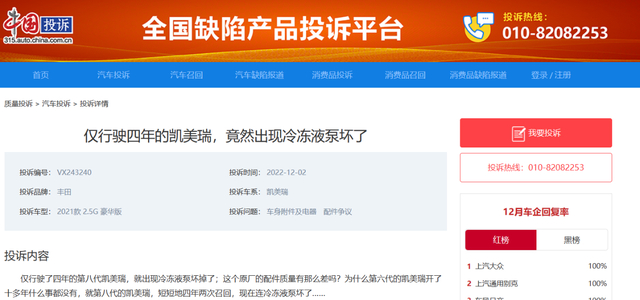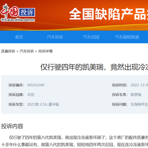 中国网汽车1月29日讯 中国投诉-全国缺陷产品投诉平台(https://315.auto.china.com.cn/) 2022年12月2日接到一位丰田凯美瑞车主的投诉,称“自己的广汽丰田第八代凯美瑞的车型开了不到4年就出现车辆冷冻液泵故障的问题”。