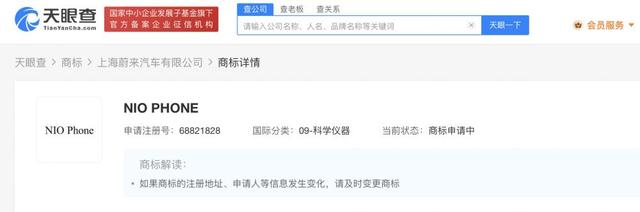 上海蔚来汽车有限公司申请注册了“NIO Phone”商标,国际分类为9类科学仪器,目前商标状态为注册申请中。