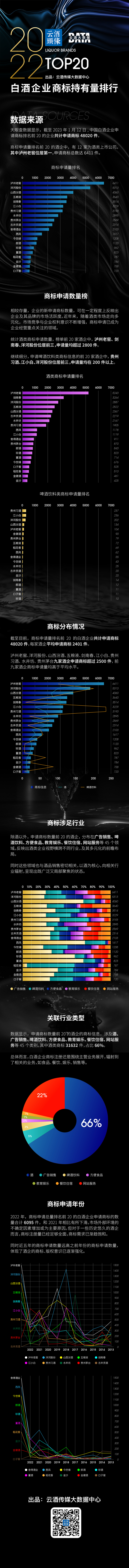 报告显示,截至2023年1月13日,中国白酒企业申请商标排名前20企业共计申请商标48020件,涉及45个行业类别,每家酒企平均申请商标2401件,同比增长16%。其中,酒类商标达31632件,占比66%。