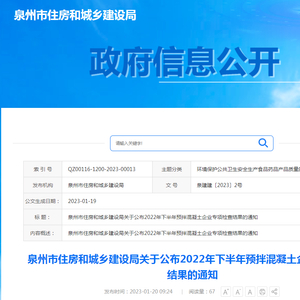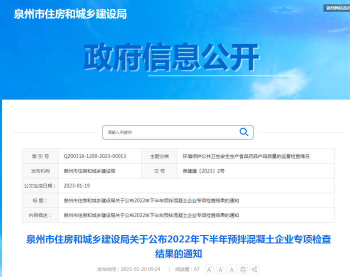 泉州市住房和城乡建设局关于公布2022年下半年预拌混凝土企业专项检查结果的通知