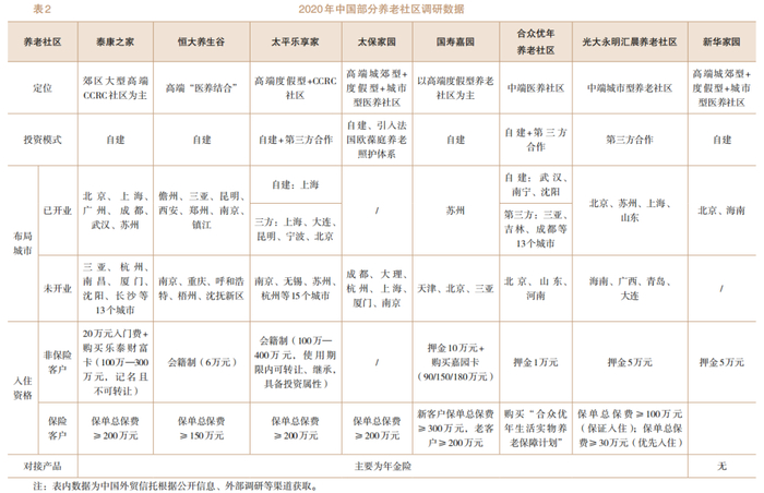 最后也要注意到,养老产业投融资目前存在着一定业务痛点,如土地租金成本高、去化周期较长、投资退出机制不完善等。面对上述痛点,资本若想在养老产业布局中找到适合的角色,需具备“养老资源、长期资金、运营能力”三要素中的至少一点。而保险资金凭借其“大资本、长资金”的优势,是养老产业资金供给的主力军。保险公司中以重资产投入模式运行的主要有泰康、太保、国寿,其布局动机一是找到长期回报稳定的持有型物业资产,满足险资收益率要求;二是通过保单对接养老社区,促进保险业务协同发展;三是以养老社区为载体,协同发展医疗健康产业。保险机构的盈利关键之处则在于低价拿地能力和保单销售能力(见表2)。