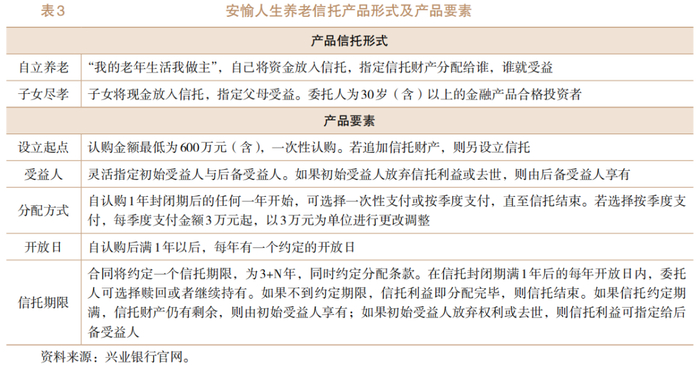 例如,安愉人生养老信托是兴业银行私人银行部携手外贸信托共同推出的一款针对高净值人群的养老金融产品,具备财产专属性和安排灵活性,先满足养老,后实现传承,帮助私人银行客户更科学地规划财产。该产品认购起点金额600万元,委托人一次性交付信托财产,成立后封闭3年,3年后按照委托人意愿,以类似年金方式每年定额向指定受益人分配信托利益(见表3)。