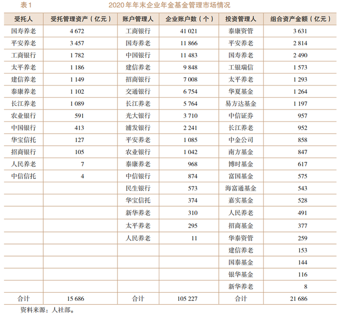 根据《企业年金基金管理办法》,我国企业年金基金管理涉及受托人、账户管理人、托管人和投资管理人四类机构主体,由人社部统一认定,采用资格准入制,金融机构需要获得相应业务资质才可从事企业年金业务。目前13家受托人主要以保险公司为主,仅有2家信托公司获得企业年金受托人资质,所占市场份额较小。18家账户管理人以银行为主,仅1家信托公司获得账户管理人资质。22家投资管理人以保险公司和公募基金为主,尚未有信托公司获得资质。信托公司在年金市场的市场份额仍有较大的拓展的空间(见表1)。