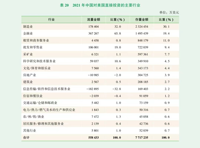 而《2021年度中国对外直接投资统计公报》中的数据则显示,从存量的行业构成看,中国对美投资分布在制造业的最多,占30.1%,其次是金融业,占19.4%,然后是租赁和商务服务业,占11%,批发和零售业占9.4%。