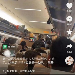据了解,这是一列由南阳东开往上海的G4506次列车,根据视频的拍摄者介绍,当时因为列车超员报警,列车停了40多分钟,中途乘务员一再解释,“超员会有危险,列车已无法运行,告知旅客可以下车后换别的列车。”最后,乘务员和乘警把站着的旅客全部查了一遍,把无票旅客全部请下车,列车才得以正常行驶,这也导致了列车最后到达时晚点。视频作者表示:“第一次遇见高铁因为人多而无法行驶的,太难了……年后返程,究竟是什么样的结局才配的上这一路的颠沛流离。”