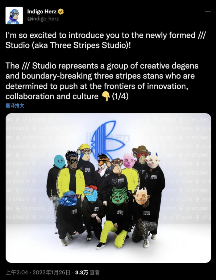 1 月 26 日,据阿迪达斯旗下 NFT 项目 Indigo Herz 在社交媒体披露,知名运动品牌阿迪达斯成立 Web3 三条纹工作室「/// Studio」(Three Stripes Studio),三条纹分别代表创新、协作和文化。