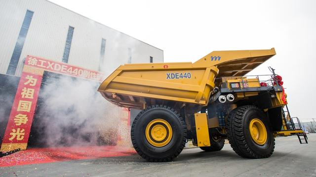 又一徐工出品的产品,型号是XDE440,全球最大刚性矿车。整车高度接近3层楼,单单轮胎高度便远超了成人身高。实物可以载重400吨,一次性装载的货物重量可以填满7个火车车厢。而它的牵引力更是相当于满载16节车厢的和谐号。