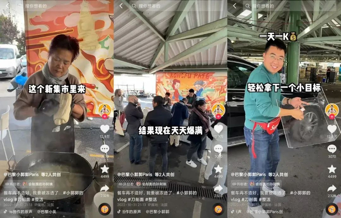 小郭郭一琢磨,干脆把丈母娘做的中国美食从家里带到巴黎集市,就这样他们在巴黎集市上支起了摊子卖刀削面。丈母娘承担“大厨”角色,小郭郭从旁协助。小郭郭不愧是短视频博主,营销思维很到位,他还在摊子旁边放上了小电视播放宣传片,摆上了介绍中国刀削面的宣传板。