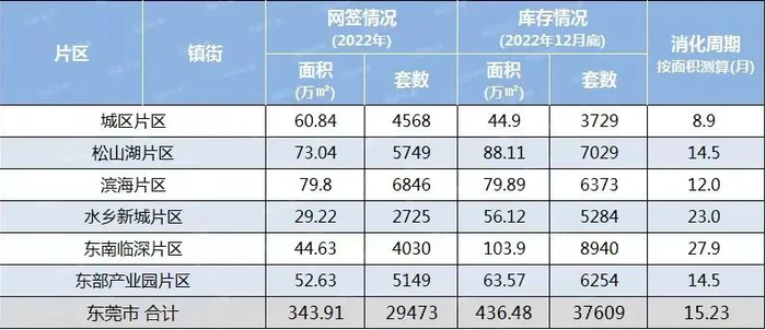 截至2022年12月31日,东莞新建商品住宅剩余库存37609套,住宅建筑面积436.48万㎡。在不增加供应的理论前提下,按照2022年月均成交面积的走货速度,东莞消化目前的住宅库存量约需15.23个月。