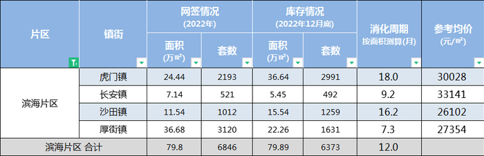 滨海片区是2022年新建商品住宅网签量最高的片区,总网签面积79.8万㎡,网签套数6846套,去化周期为12个月。