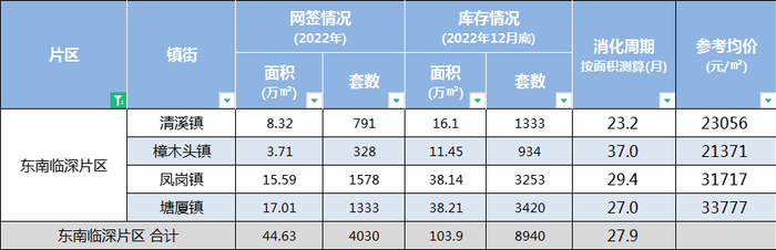 2022年东南临深片区全年新房住宅网签44.63万/㎡,库存面积103.9万㎡,去化周期达27.9个月,也就是说整个东南临深的房子需要花2年半才能卖完,不得不说压力巨大。