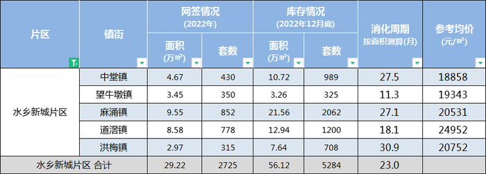 曾经的房价洼地水乡片区,如今新房房价均已在2万/㎡上下,2022年片区新房住宅网签面积共29.22万㎡,库存面积56.12万㎡,去化周期23个月。